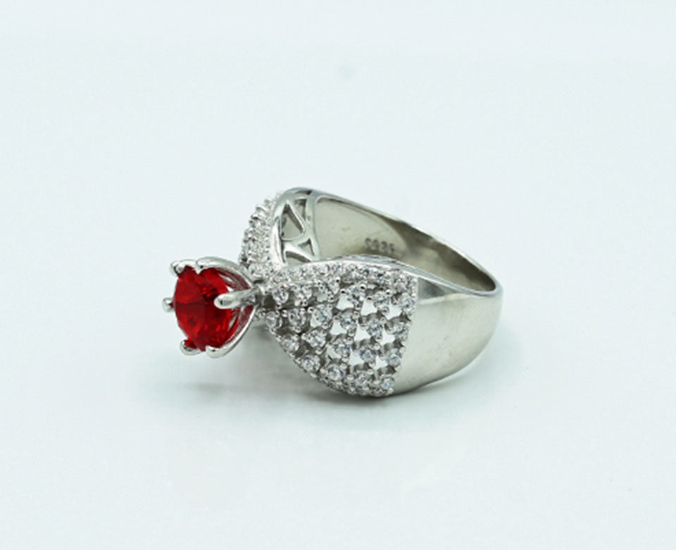 This exquisite Silver 925 ladies' ring is rhodium-plated for a brilliant finish, featuring a stunning spinel ruby at the center, accented with sparkling zircons, adding a touch of elegance and luxury to any collection.