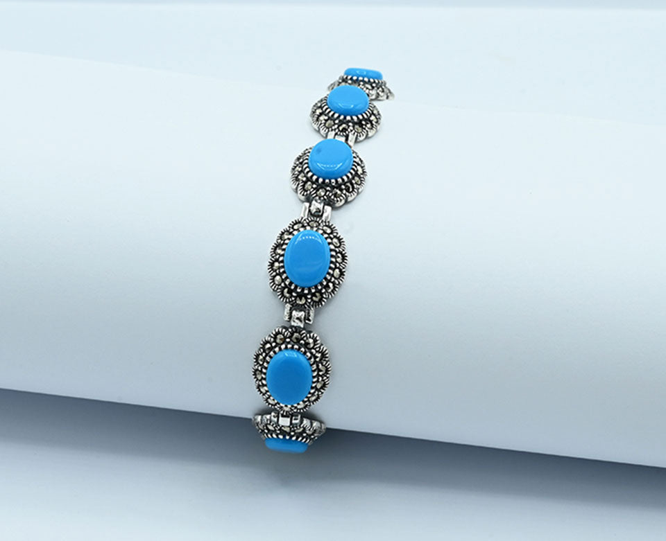 Elevate your style with this stunning Turkish-inspired bracelet. It features intricate detailing and is beautifully studded with vibrant blue stones, adding a touch of elegance and color to any outfit. A perfect blend of timeless design and modern flair.
